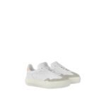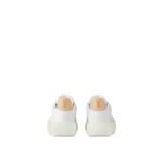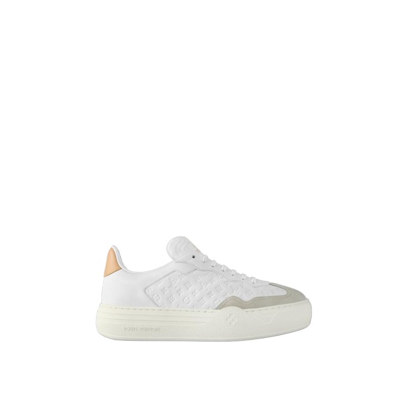 The LV Groovy platform sneaker comes in soft calf leather, which is debossed with Louis Vuitton’s iconic Monogram pattern. This model combines a Seventies-inspired upper with an oversized, elevated outsole. Key details include the Monogram Flower lace accessory, the natural leather trim at the back, and the specially designed Louis Vuitton signature on the tongue.