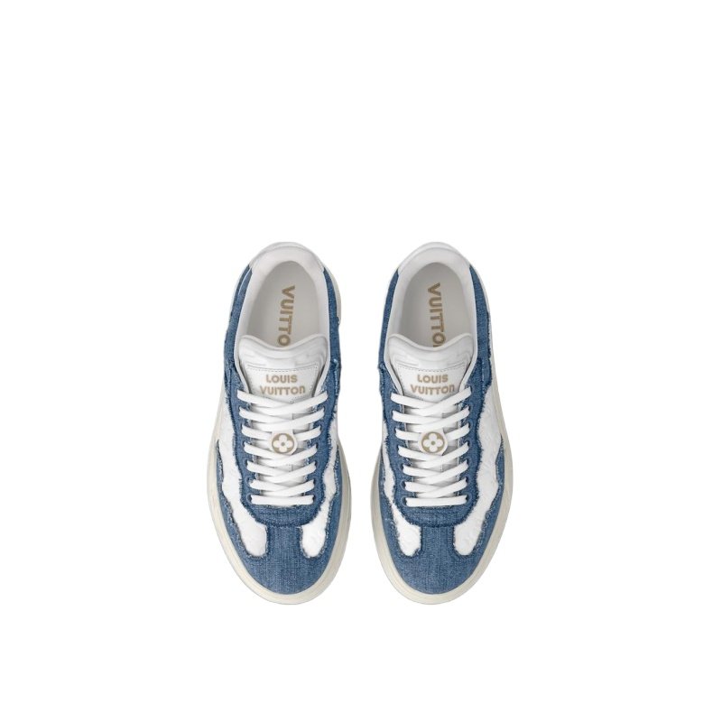 The LV Groovy sneaker is revisited this season in a combination of fringed denim and Monogram-debossed calf leather. This model is characterized by its Seventies-inspired upper and fashionable platform outsole, which is decorated with a Monogram Flower. A Monogram Flower also appears on the tongue, alongside the Louis Vuitton signature.