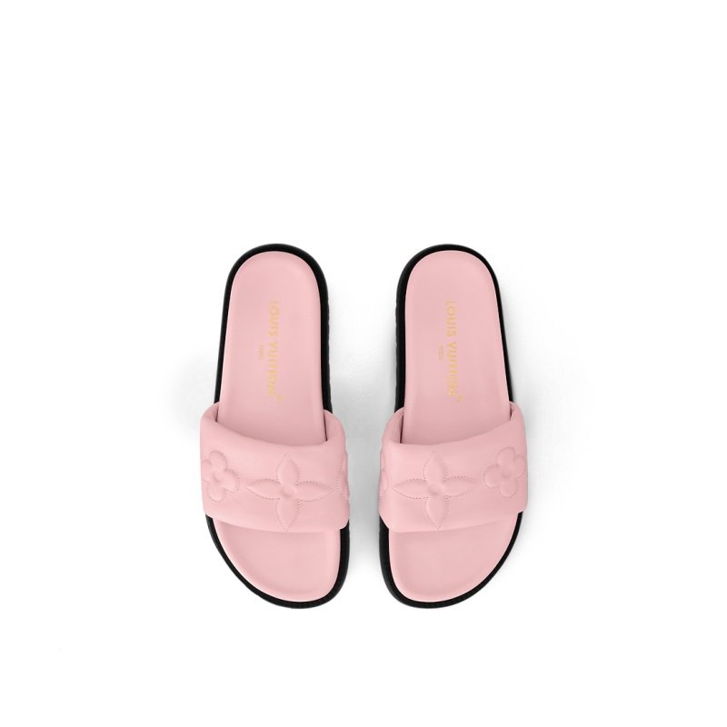 Part of the Summer Holiday collection, the LV Shore flat comfort mule is made of soft calf leather. This relaxed, easy-to-wear model is notable for its wide front strap, which is embossed with oversized Monogram Flowers. The comfortable anatomic insole is color-matched to the upper, while the outsole comes in lightweight Eva.