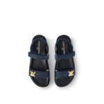 The LV Sunset flat comfort sandal is reinterpreted this season in raw indigo denim for a relaxed, summery look. This model is notable for its two adjustable velcro straps, the front one embellished with a gold-tone LV Twist accessory. A padded anatomic insole and lightweight micro outsole complete this exceptionally comfortable style.