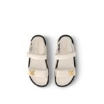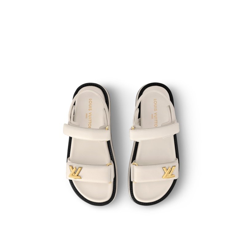The LV Sunset platform comfort sandal in grained calf leather brings an on-trend platform style to the LV Sunset line. This model retains the line’s two lightly padded straps, which are adjusted with velcro, as well as its comfortable anatomic footbed, while adding a leather-covered platform. The front strap is signed with an LV Twist accessory.