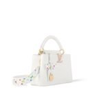 Joyful detailing from the re-edition of the Louis Vuitton x Murakami uplifts the House’s iconic Capucines handbag with a playful spirit. Crafted from Taurillon leather, the emblematic LV Initials and removable Monogram strap are accented with vibrant tones inspired by the artist’s signature rainbow palette, while a chic bow-shaped keybell with a padlock attachment completes the look. The compartmented interior is large enough for daily essentials and organized with multiple pockets.