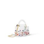 The Capucines East-West Mini is playfully reimagined as part of the re-edition of the Louis Vuitton x Murakami collection to make an elegant statement. Printed and emobossed on cowhide leather, the House’s iconic Monogram Flowers are vibrantly reimagined in the Japanese artist’s vernacular superflat style, while a fresh blue shade adds a pop of color to the iconic LV Initials and removable braided strap.