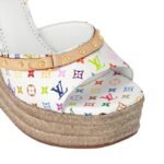 The Helios wedge sandal from the re-edition of the Louis Vuitton x Murakami collection combines an elegant, espadrille-inspired rope sole with a statement coated canvas upper embellished with a joyful rendition of the Monogram motif in playful rainbow tones. The slim ankle strap is secured with a delicate gold-toned buckle, while a studded natural leather trim completes the look with a rebellious touch.