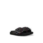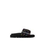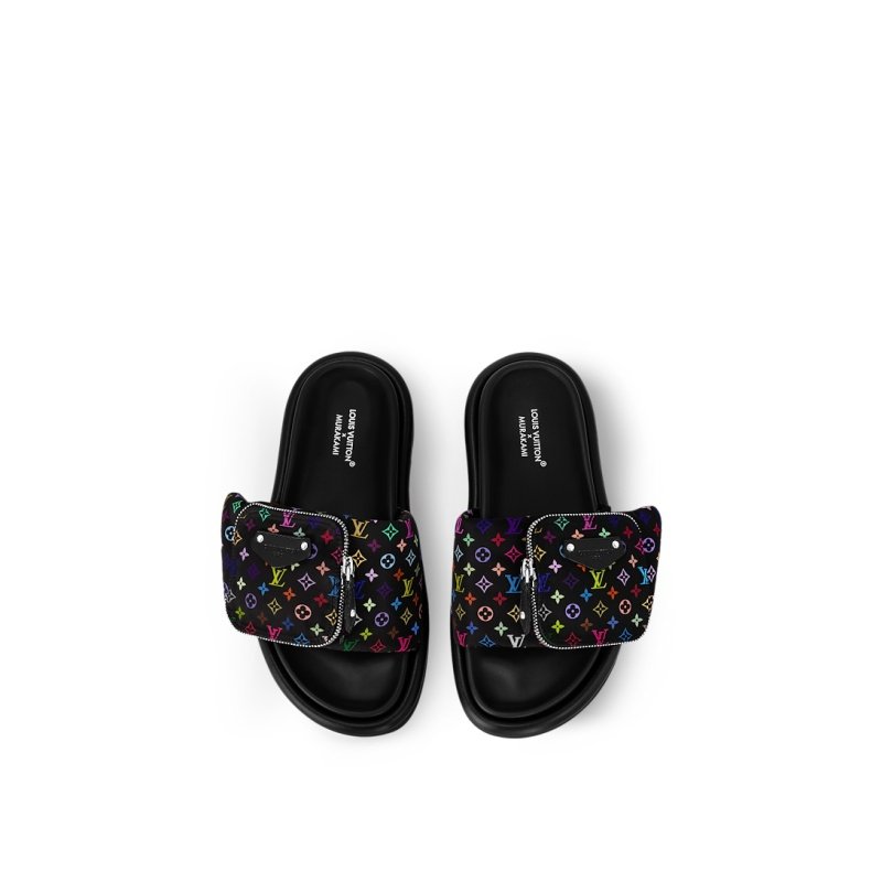 The Pool Pillow flat comfort mule from the cross-category Louis Vuitton x Murakami collection makes a bold contemporary statement thanks to a wide, padded velcro strap embellished with a zipped pouch. The allover Monogram motif is vibrantly uplifted in cheerful tones inspired by Japanese artist Takashi Murakami??s signature multicolored aesthetic, while an anatomic footbed and lightweight treaded outsole offer casual comfort.