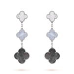 Magic Alhambra earrings, 3 motifs, rhodium plated 18K white gold, white and gray mother-of-pearl, chalcedony.