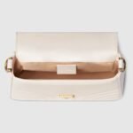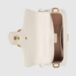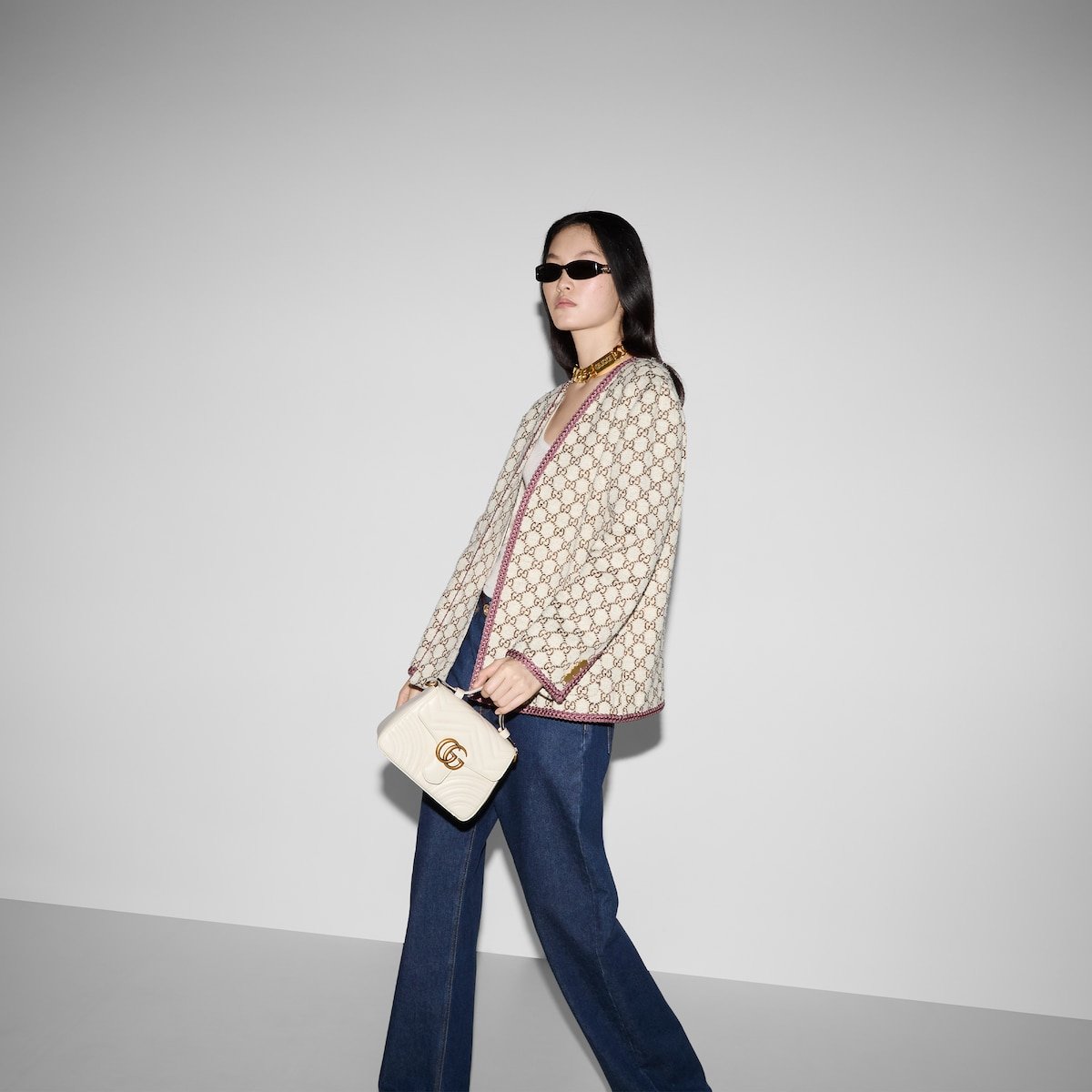 The mini GG Marmont top handle bag has a softly structured shape and an oversized flap closure with Double G hardware. Equipped with a leather top handle and chain shoulder strap, made in matelass?? chevron leather with a heart on the back.