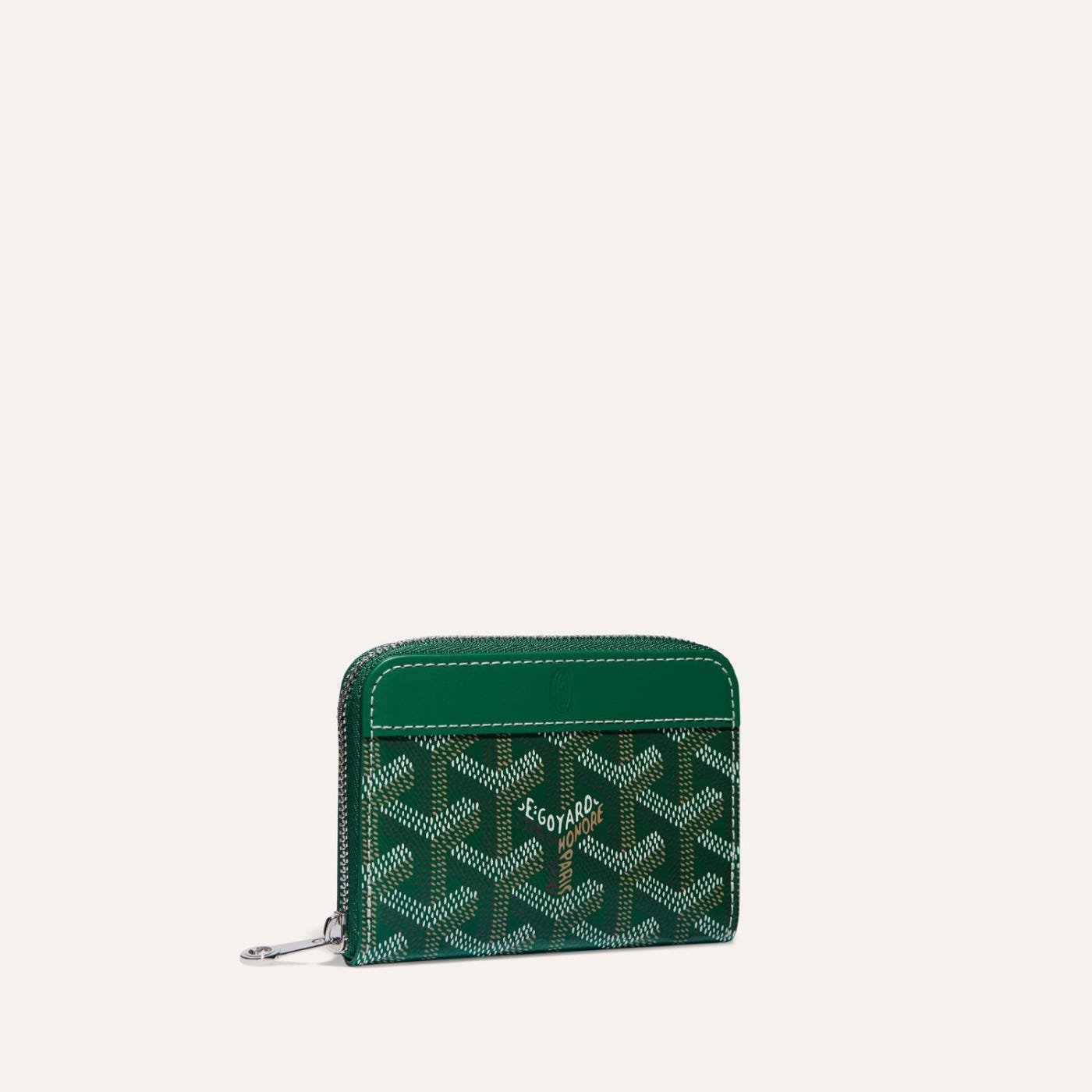The Matignon Mini wallet is secured with its zip closure. Its central section is for change while the inside flat pocket is for cards and receipts.
