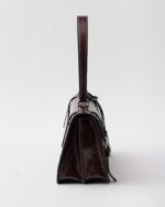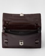 Inspired by rigid and formal work bags, this leather bag with a delicate glossy finish reinterprets classic office silhouettes with a new attitude. The archetypal shape is softened and enriched with sophisticated, feminine details. The vertical clasp, taken from the archives, embellishes the accessory characterized by a long handle that can also be worn over the shoulder.