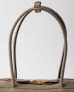 This leather top-handle bag features a modern design with refined details and a versatile style. Its sleek geometric silhouette, complemented by long handles for effortless wear on the shoulder, is enhanced with metal logo lettering.