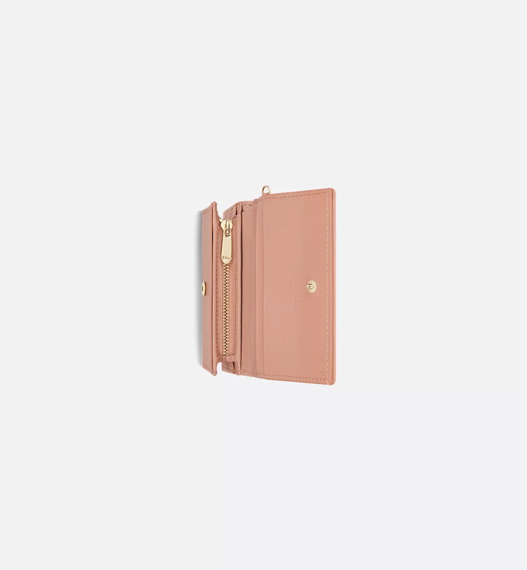 The Lady Dior Gardenia wallet is both compact and spacious. The combination of Rose des Vents lambskin with Cannage topstitching and detachable D.I.O.R. charms creates a chic and timeless look. The miniature accessory can hold all the daily essentials and may easily be coordinated with other items from the Lady Dior line.