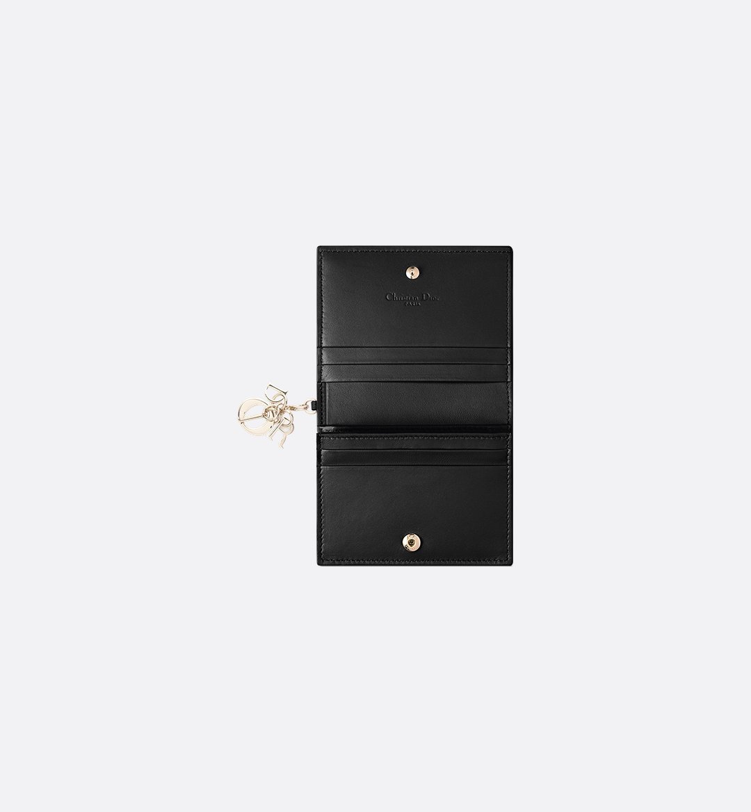 The Lady Dior Gardenia wallet is both compact and spacious. The combination of black lambskin with Cannage topstitching and detachable D.I.O.R. charms creates a chic and timeless look. The compact miniature accessory can hold all the daily essentials and may easily be coordinated with other items from the Lady Dior line.