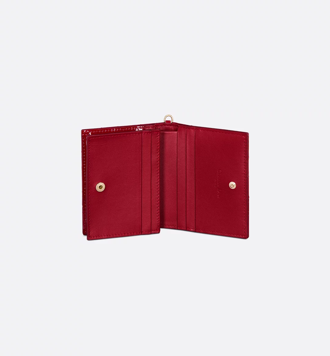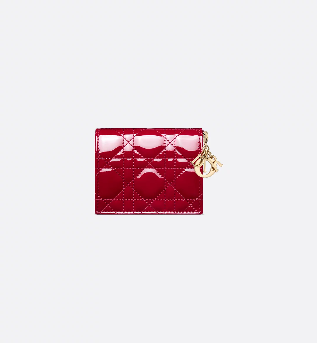 The Lady Dior Gardenia wallet is both compact and spacious. The combination of cherry red patent calfskin with Cannage topstitching and detachable D.I.O.R. charms creates a chic and timeless look. The miniature accessory can hold all the daily essentials and may easily be coordinated with other items from the Lady Dior line.