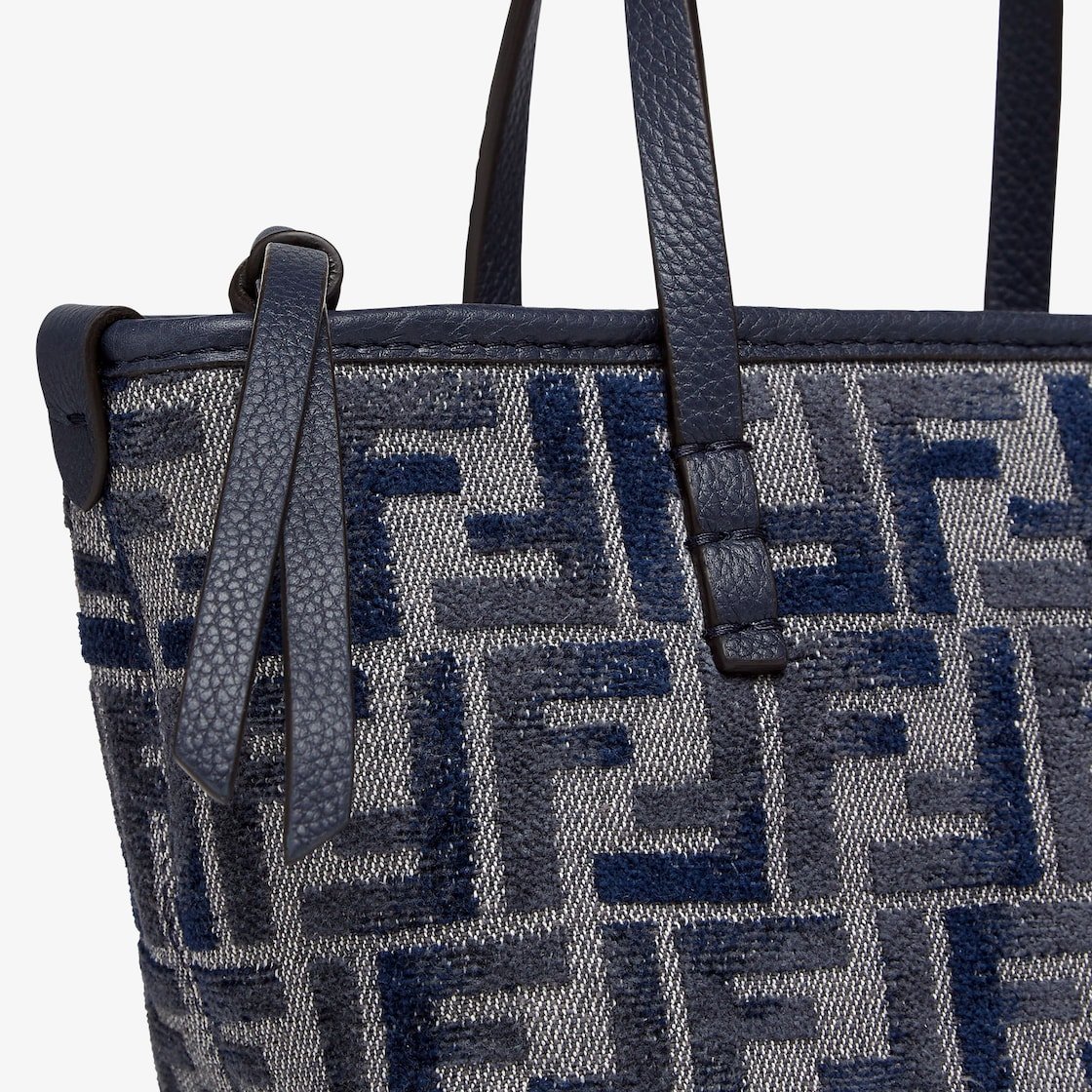 Made of chenille with the iconic FF motif in dark blue gradient tones, embellished with dark blue calfskin trimming. Zip closure with a long, knotted leather zip-pull.