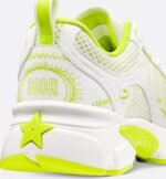 Part of the Miss Dior capsule, the Dior Chrono sneaker revisits the running shoe with the House’s couture codes. Pairing mesh with white leather-effect panels, it is accented by hallmark lime green details like the CD signature on the sides, a star patch on the tongue and a rear Dior signature. Featuring two-tone laces and an ultralightweight sole adorned with a star, the sneaker will complete laid-back outfits year-round and coordinates with other creations from the Miss Dior capsule.