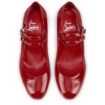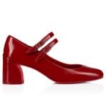 The Miss Jane pump is distinguished by its bevelled, wide 55 mm heel. Entirely crafted from Vog Loubi red patent leather, it features a rounded toe and Maison Christian Louboutin’s signature audacious vamp. Two slender straps with a metallic clasp delicately adorn the foot. The ‘Vog patent leather’ material, being more flexible, offers better suppleness. Its wrinkled effect may have slight variations between the photo and the product.