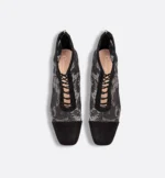 The Naughtily-D heeled ankle boot showcases streamlined, elegant lines. Offering a sophisticated play of transparency, the mesh style is fully embroidered with a black Dior Roses motif and embellished with the Christian Dior signature and tonal suede goatskin details. The ankle boot is distinguished by its no-tongue design for an openwork effect. The 8 cm (3-inch) block heel and laces complete the delicate creation.