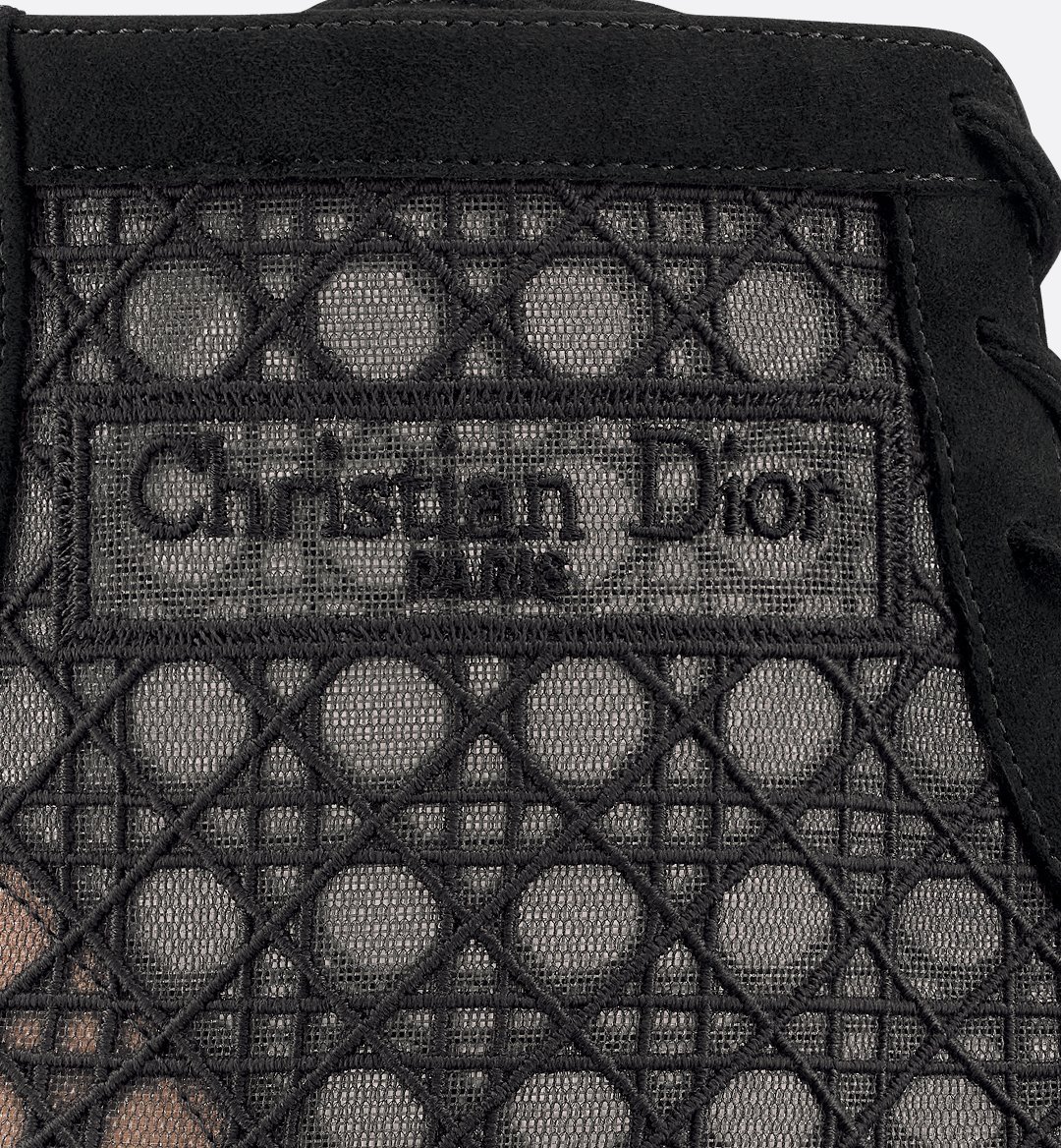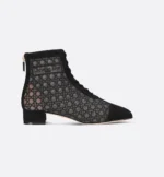The Naughtily-D heeled ankle boot draws inspiration from House codes in a streamlined and elegant silhouette. Offering a sophisticated interplay of transparency, the mesh style is fully embroidered with a black Cannage motif and embellished with the Christian Dior Paris signature and black suede goatskin detailing. The ankle boot is distinguished by its no-tongue design for an openwork effect. The 3-cm (1-inch) block heel and laces complete the delicate creation.