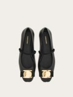 Inspired by a classic, this contemporary ballet flat features a super soft leather upper with ruffles at the pointed tip just like their namesake. The gros grain elastic across the upper duets with Vara bow held by the new Ferragamo buckle at the toe. Knurled rubber flexible sole.