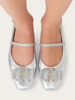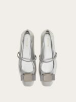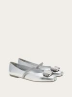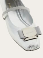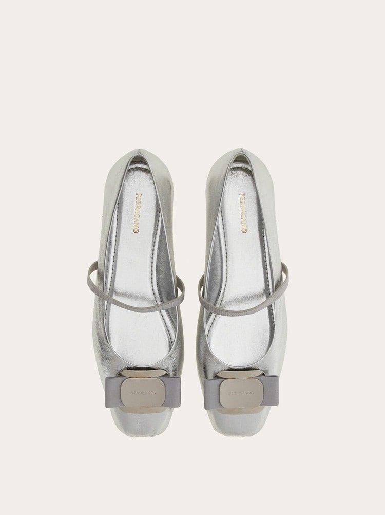 Inspired by a classic, this contemporary ballet flat features a super soft laminated silver leather upper with ruffles at the pointed tip just like their namesake. The gros grain elastic across the upper duets with Vara bow held by the new Ferragamo buckle at the toe. Knurled rubber flexible sole.