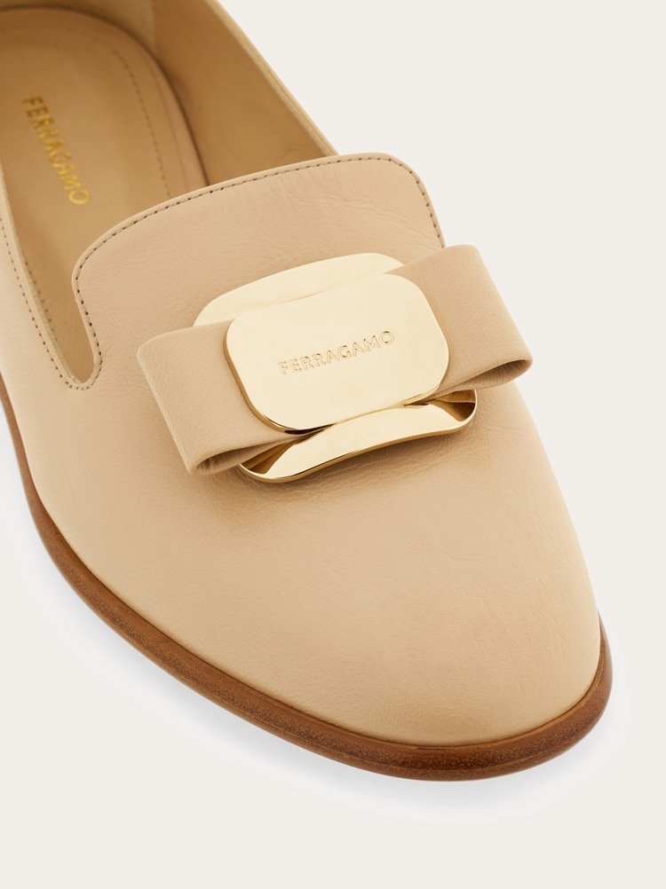 Simple and refined, this patent leather loafer is a statement shoe for its nonchalant sophistication. Featuring a soft leather padded insole, the upper has a slightly squared tip with a tonal leather bow that slides through the new Ferragamo buckle in a gold tone. The perfect balance of masculine inspiration with feminine flair.
