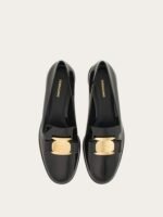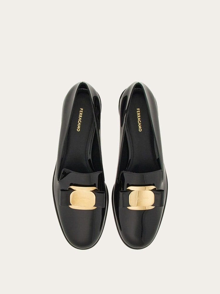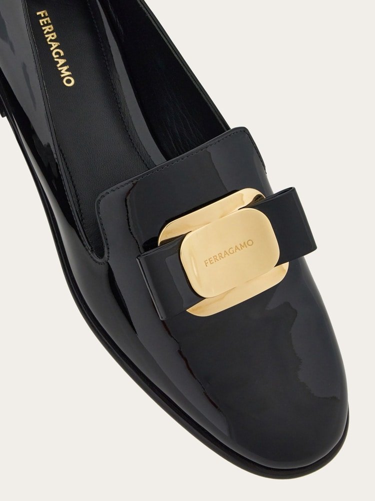 Simple and refined, this patent leather loafer is a statement shoe for its nonchalant sophistication. Featuring a soft leather padded insole, the upper has a slightly squared tip with a tonal leather bow that slides through the new Ferragamo buckle in a gold tone. The perfect balance of masculine inspiration with feminine flair.