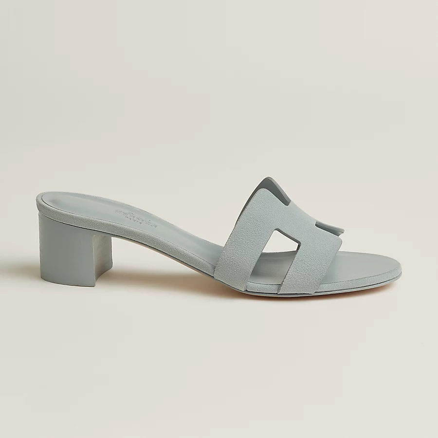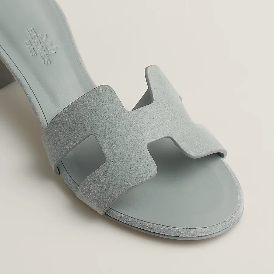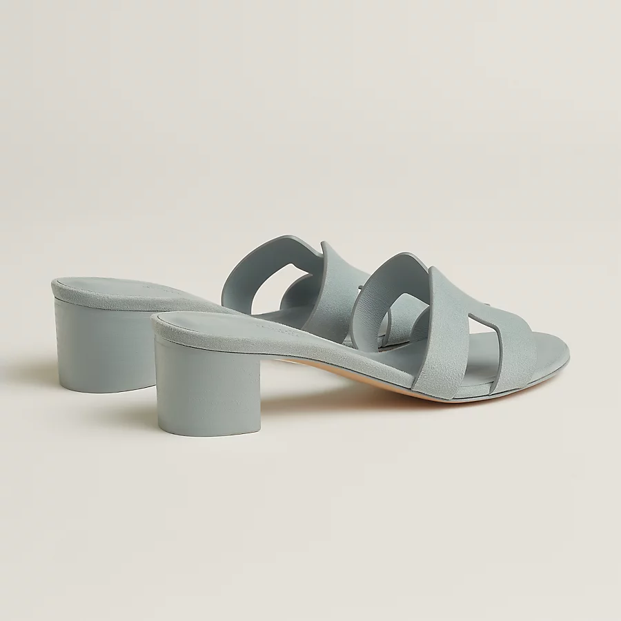 High heel sandal in suede goatskin with iconic ‘H’ cut-out detail and straight-cut edges.