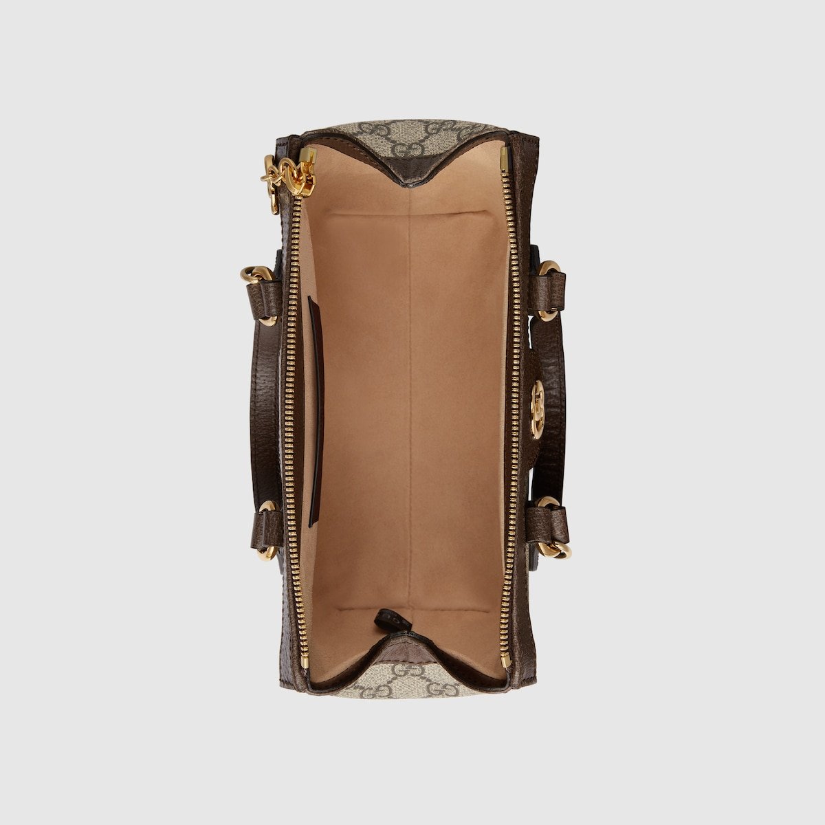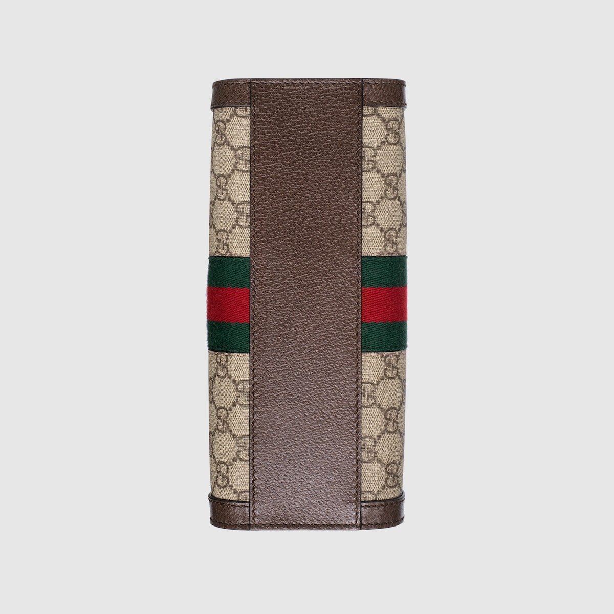 The world of Ophidia evolves with the introduction of a small top handle tote with a detachable shoulder strap. Crafted in GG Supreme canvas with inlaid green and red Web stripe, the accessory is enhanced by a petite play on the Double G, an archival Gucci code from the ’70s that appears on a leather tab detail and on the zipper pull.