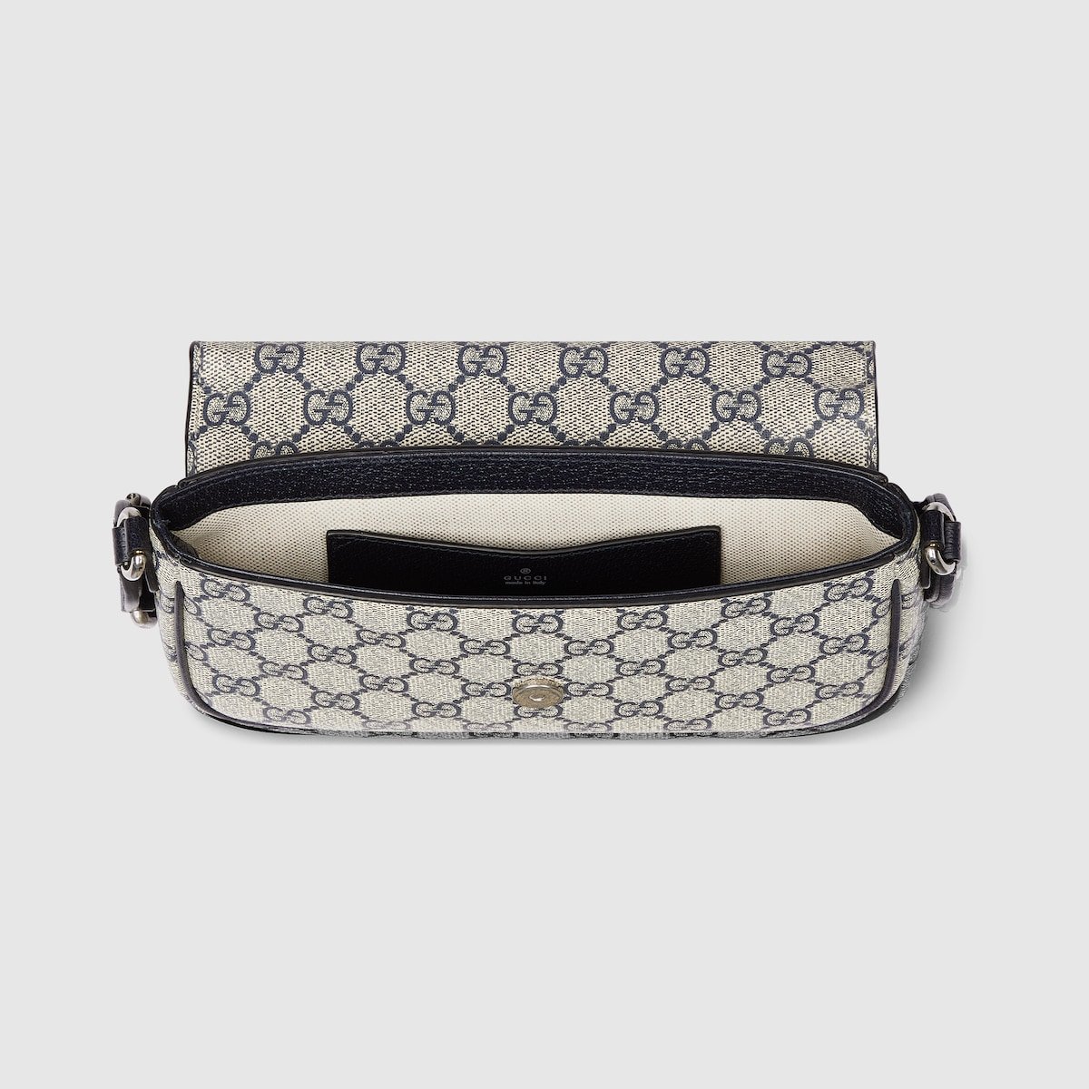 The world of Ophidia continues to evolve, incorporating new shapes and materials each season. Crafted from beige and blue Supreme canvas, this mini bag is further enriched by the Double G hardware and a Web shoulder strap.