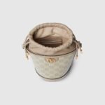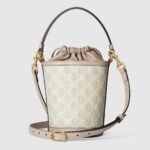 The Ophidia line is further elevated through new sizes and styles including variations with top handles as well as shoulder straps, allowing for versatile wear. The signature Double G hardware completes this mini bucket bag in a light gold against a beige and white GG Supreme canvas base.