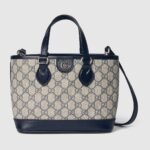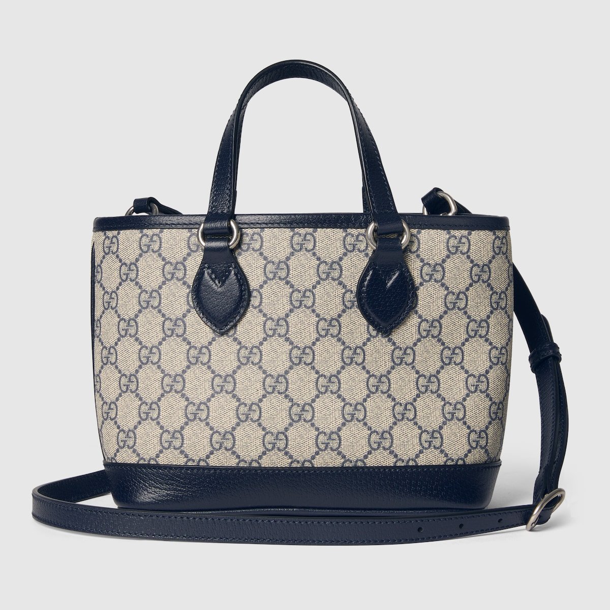 The Ophidia line is further elevated through new sizes and styles, like this mini tote bag which has a detachable pouch and detachable leather shoulder strap, allowing for versatile wear. The beige and blue GG Supreme canvas is complete with light gold-toned Double G hardware.