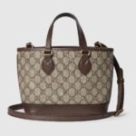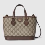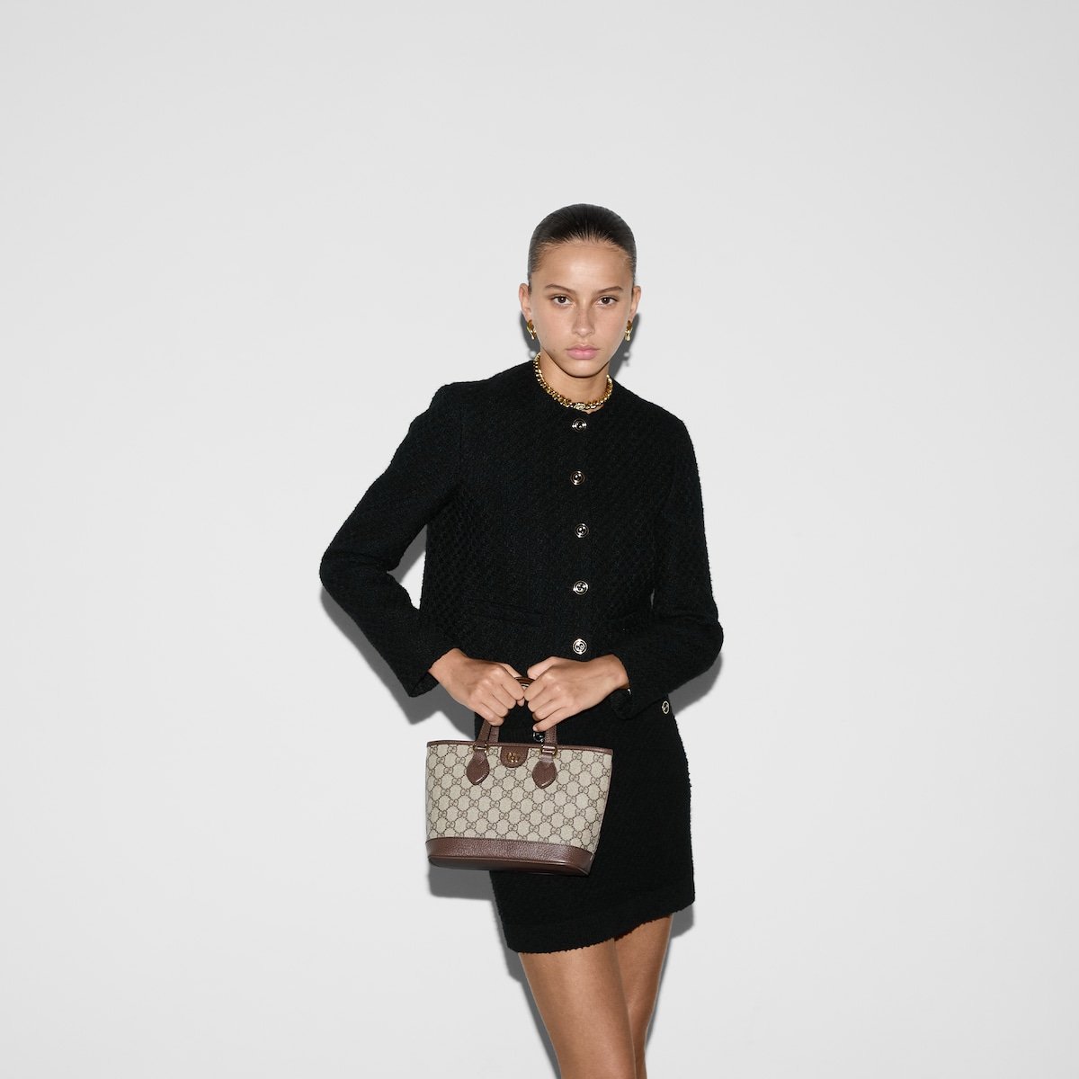 The Ophidia line is further elevated through new sizes and styles, like this mini tote bag which has a detachable pouch and detachable leather shoulder strap, allowing for versatile wear. The beige and ebony GG Supreme canvas is complete with light gold-toned Double G hardware.