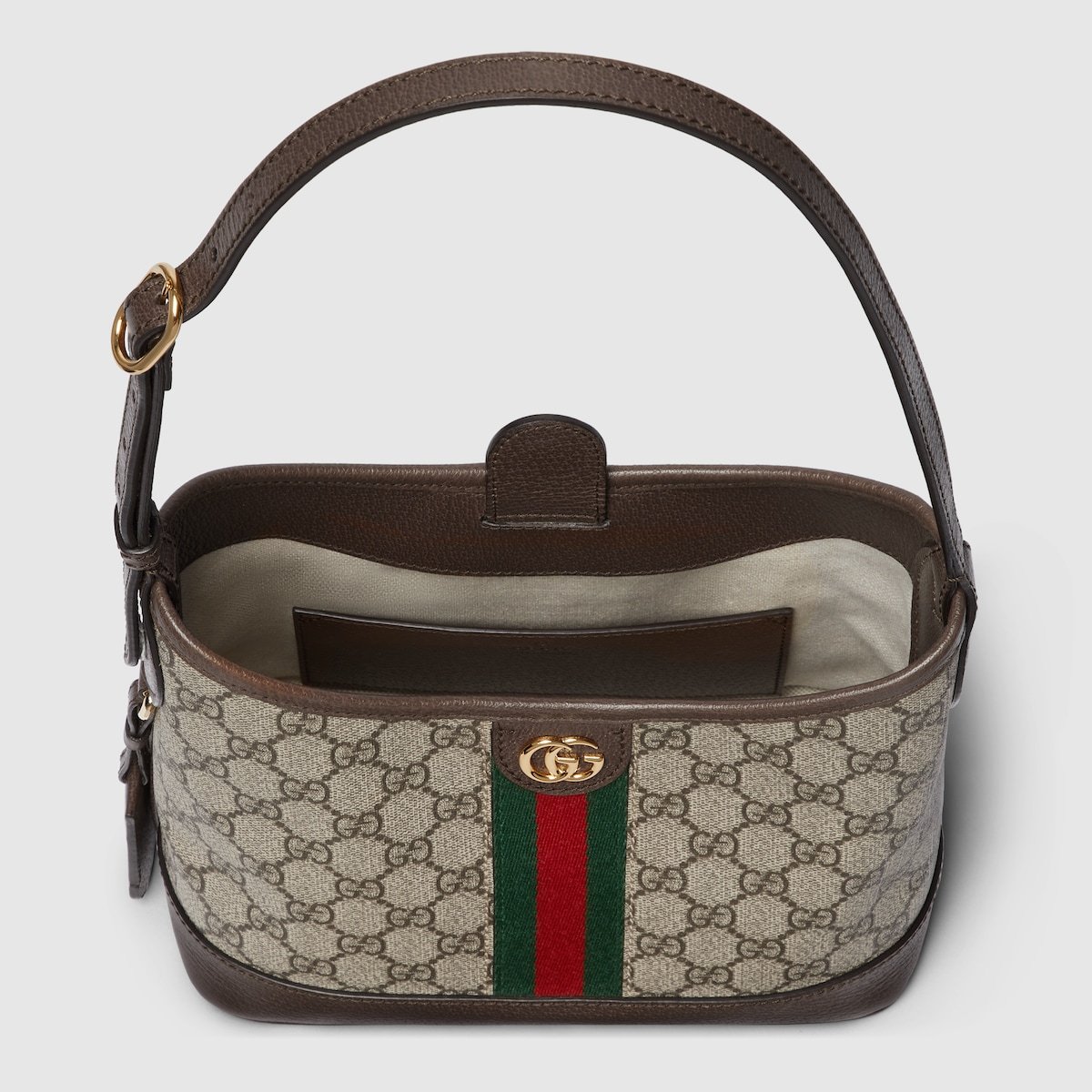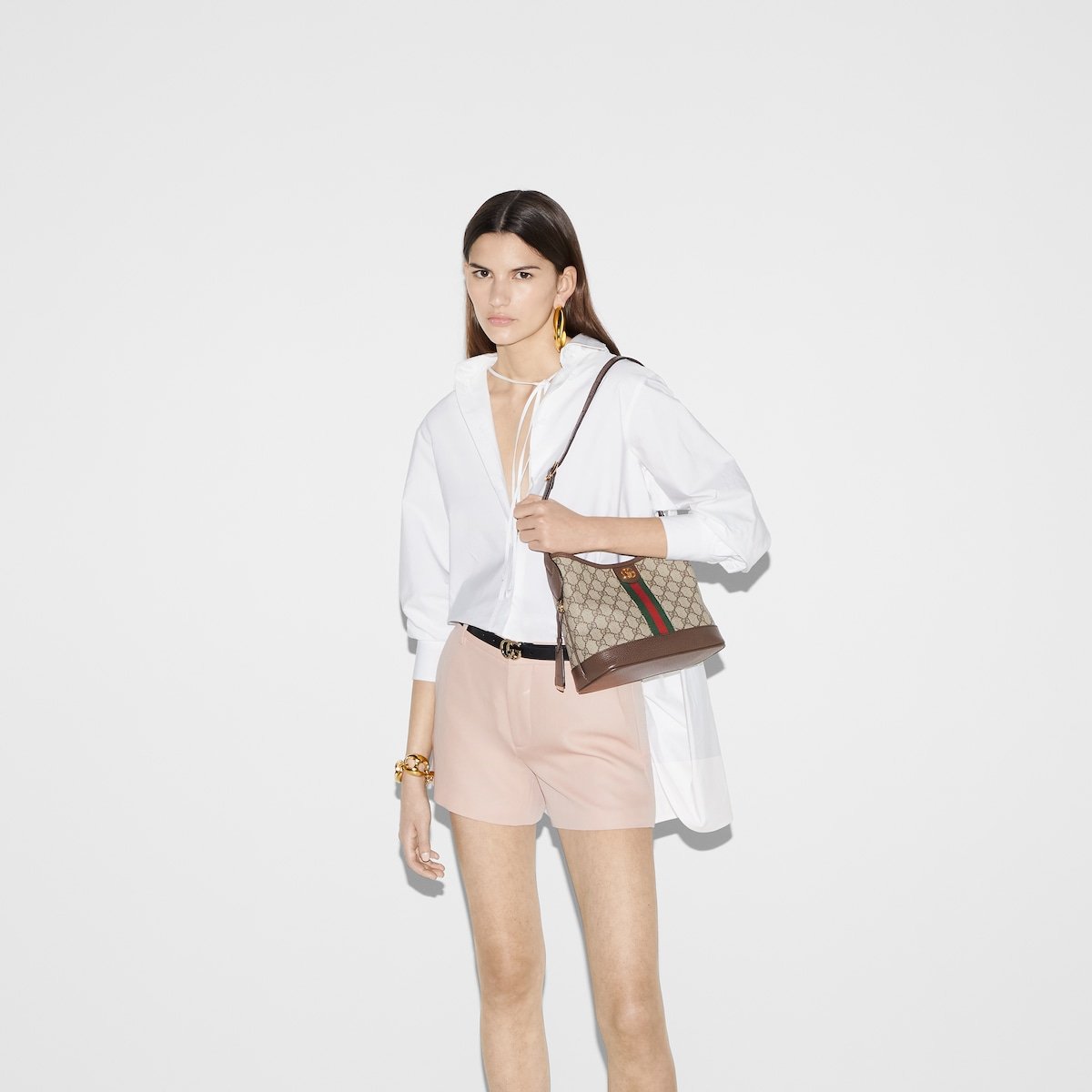 The Ophidia is reinvented in new and unexpected ways in this small-sized piece which blends the open bucket design and shoulder bag style. It is crafted in the House’s signature GG Supreme canvas in the iconic color combination of beige and ebony.