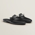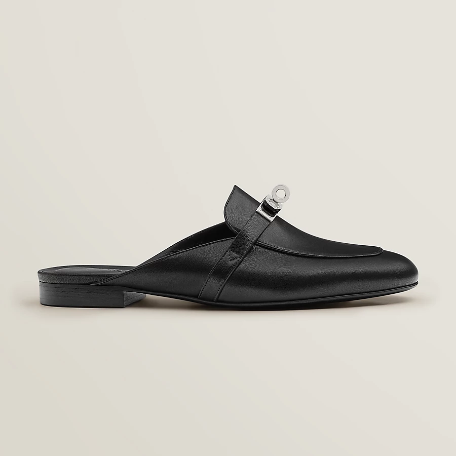 Mule in goatskin with iconic palladium plated Kelly buckle.