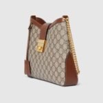 Drawing from the House’s origins as an artisanal luggage atelier, the Padlock closure features prominently on this shoulder bag in GG Supreme canvas. It is complete with gold-toned hardware, smooth brown leather trim, a chain and leather shoulder strap.