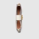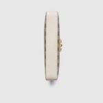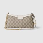 Drawing from the House’s origins as an artisanal luggage atelier, the Padlock closure features prominently on this small shoulder bag in beige and ebony GG Supreme canvas, with white leather trim, and a new adjustable leather and chain strap. It is complete with gold-toned hardware and key with leather holder.