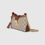 Drawing from the House’s origins as an artisanal luggage atelier, the Padlock closure features prominently on this small shoulder bag in beige and ebony GG Supreme canvas, with brown leather trim, and a new adjustable leather and chain strap. It is complete with gold-toned hardware and key with leather holder.