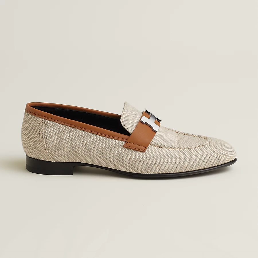 Loafer in linen canvas and calfskin with signature Paris buckle.