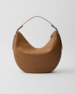 The classic hobo bag is reinterpreted with a current design that plays with emphasized volumes and curvy lines. An extremely soft shape characterizes the roomy silhouette with adjustable handle, enriched with sleek details and brightened by metal hardware. The enameled metal triangle logo adds a distinctive signature touch to the versatile and contemporary accessory.