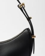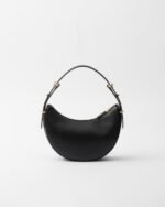 This sleek leather bag has a versatile, modernist allure. The accessory with a sinuous silhouette is completed by the leather extension and detachable shoulder strap for wearing different ways. The bag with nappa leather interior and metal hardware is embellished with the enameled metal triangle logo on the front.