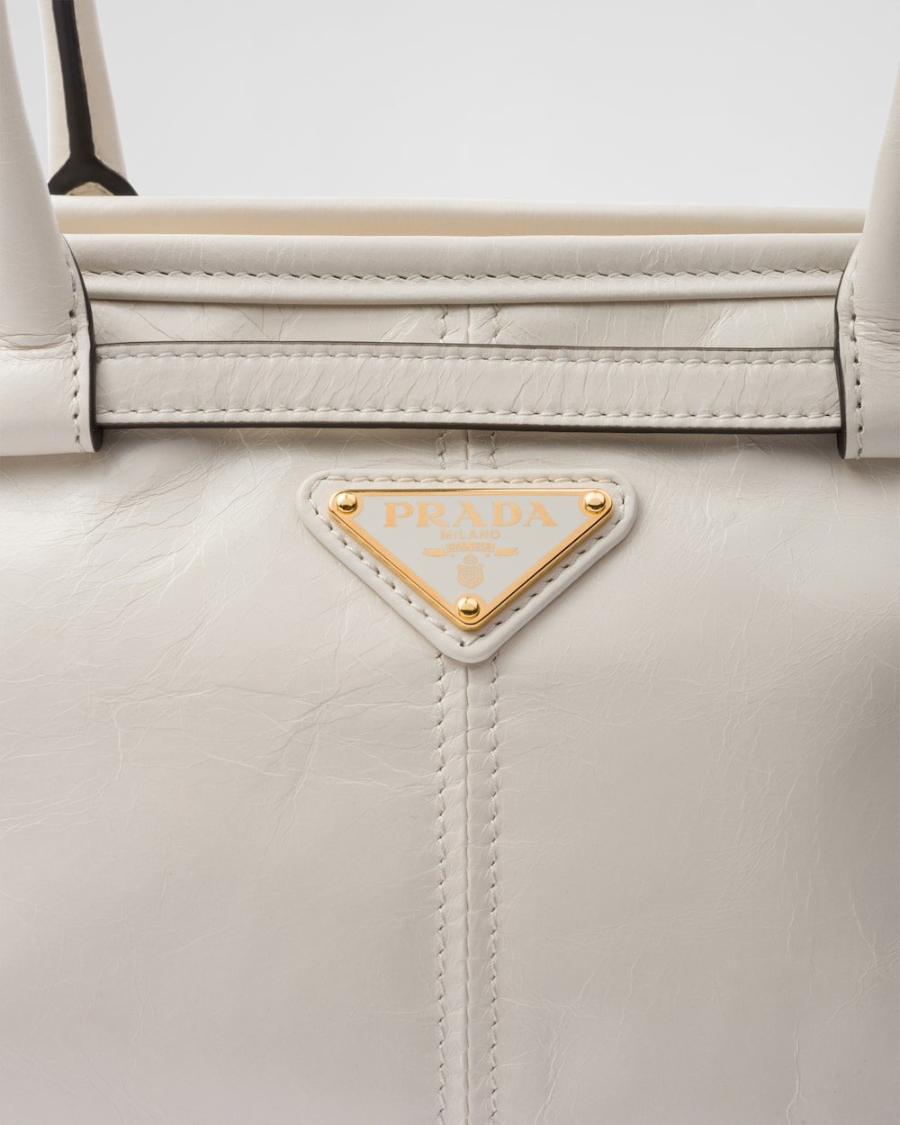 This pragmatic and refined handbag is made of soft leather with a glossy finish that emphasizes its versatile, modern allure. The geometric design blends different influences into one style with a distinctive but sleek aesthetic. Embellished by the sophisticated strap detail, the rectangular silhouette has zipper pockets inside. The enameled metal triangle logo completes the look with its iconic signature.