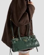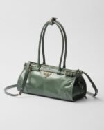 This pragmatic and refined handbag is made of soft leather with a glossy finish that emphasizes its versatile, modern allure. The geometric design blends different influences into one style with a distinctive but sleek aesthetic. Embellished by the sophisticated strap detail, the rectangular silhouette has zipper pockets inside. The enameled metal triangle logo completes the look with its iconic signature.