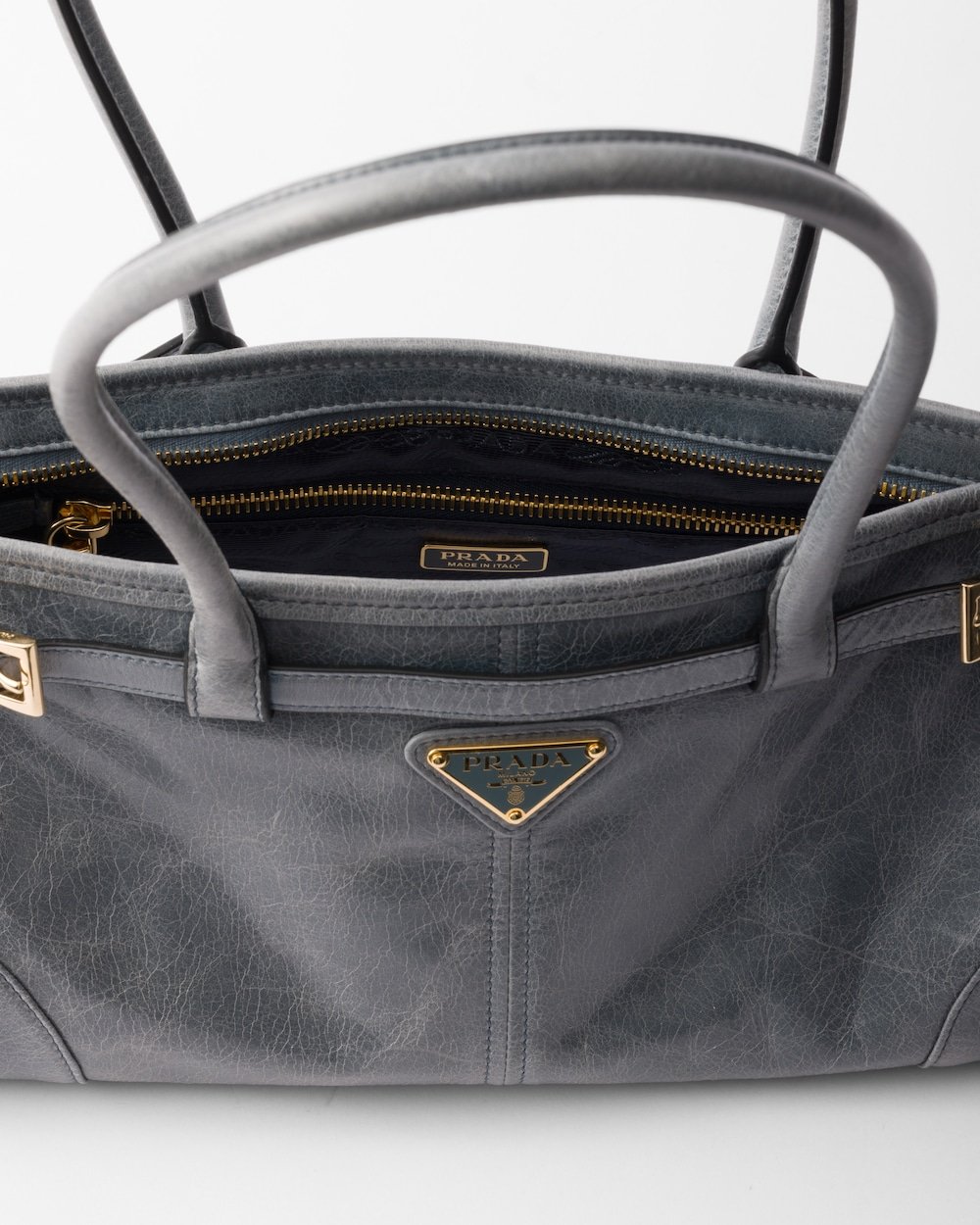 This pragmatic and refined handbag is made of soft leather with a glossy finish that emphasizes its versatile, modern allure. The geometric design blends different influences into one style with a distinctive but sleek aesthetic. Embellished by the sophisticated strap detail, the rectangular silhouette has zipper pockets inside. The enameled metal triangle logo completes the look with its iconic signature.
