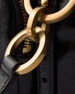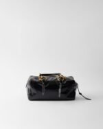A new interpretation of the top-handle bag features a soft geometric shape and is made of shiny leather with a vintage finish. Its retro charm is emphasized by the antiqued metal hardware and the archive-inspired zipper pocket.