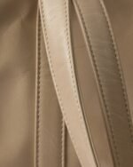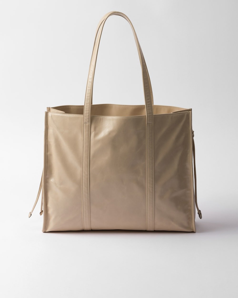 This contemporary and pragmatic tote has a sleek, roomy silhouette and is made of leather with a glossy finish.