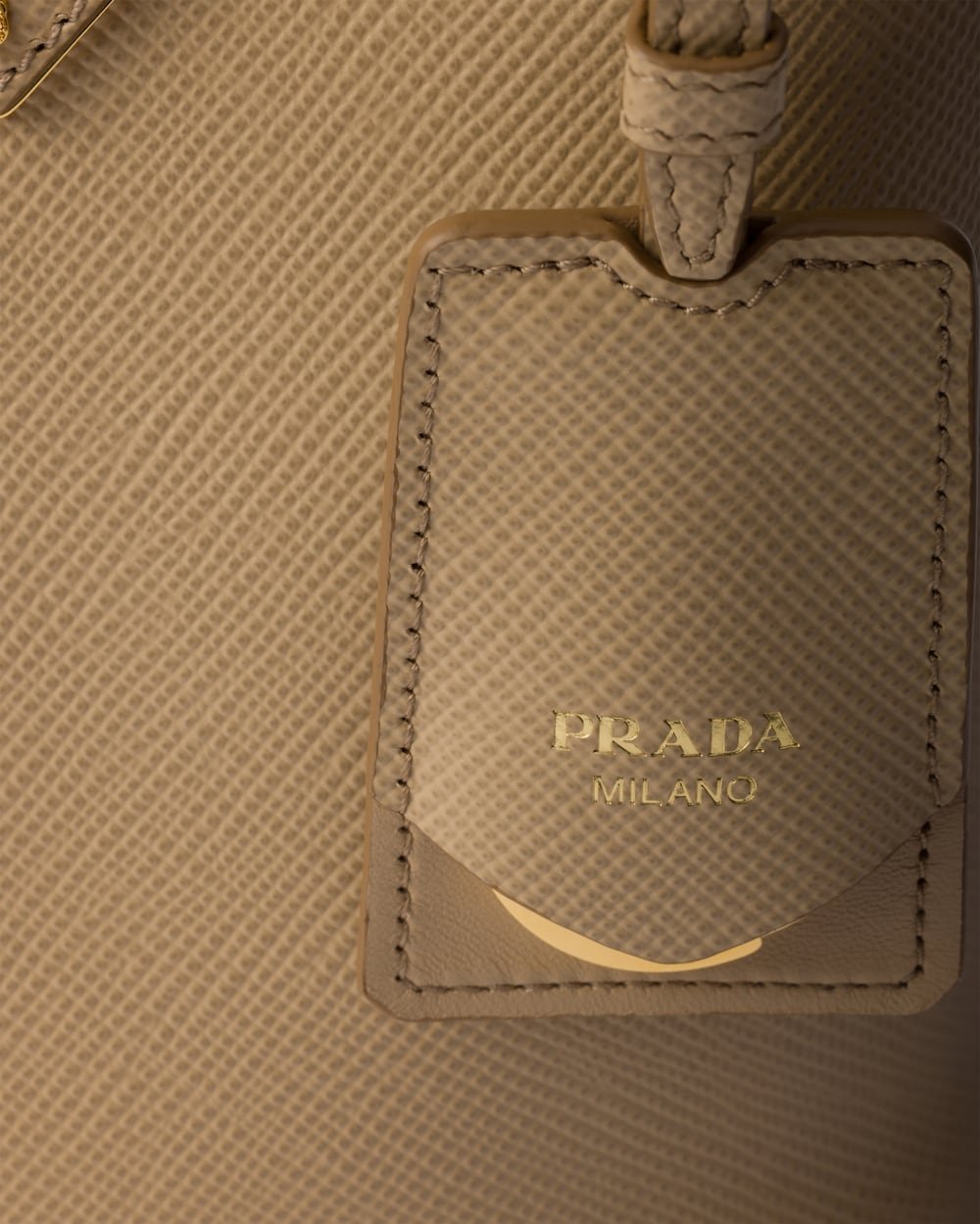 The sleek, geometric silhouette of the Prada Panier bag is reinterpreted in a compact and refined mini version. The accessory made of Saffiano leather, an emblematic material of Prada collections, is embellished with sophisticated details that express artisan excellence.