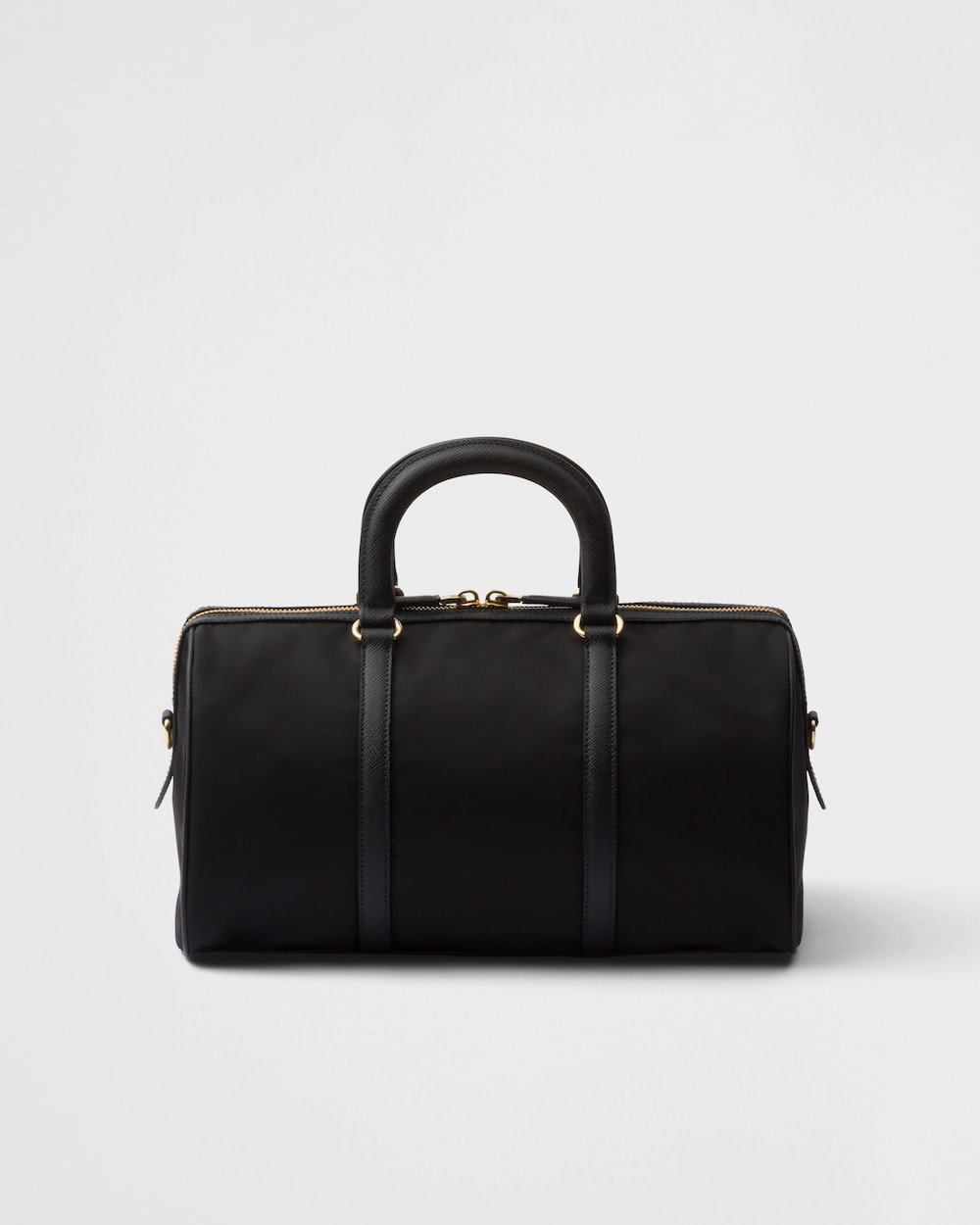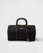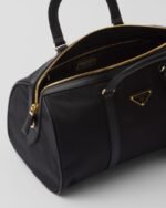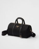 An archive silhouette with timeless allure is reinterpreted with a contemporary design, emphasized by the exclusive combination of two of Prada’s iconic materials. Made of Re-Nylon, the innovative regenerated and sustainable nylon fabric, the top-handle bag with a structured shape is enriched with elegant details in Saffiano leather and metal hardware. The pragmatic but sophisticated accessory is embellished with the enameled metal triangle logo.