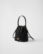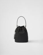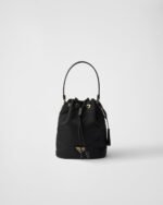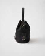This mini-bag made of Re-Nylon with a bucket silhouette is a Re-Edition of an archive style. The accessory, worn as a handbag or with a detachable shoulder strap, is enriched with leather details, while the enameled metal triangle logo completes it with its iconic signature touch.