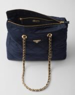 A re-edition of an iconic style of 1995, this shoulder bag summarizes Prada codes in a casual, versatile silhouette that establishes a dialog between stylistic languages of past and present. The design with soft volumes is made of Re-Nylon, the innovative regenerated nylon yarn, defined by iconic stitching that reveals a geometric pattern. The leather and metal chain handles complete the accessory with vintage charm, decorated with the enameled metal triangle logo.