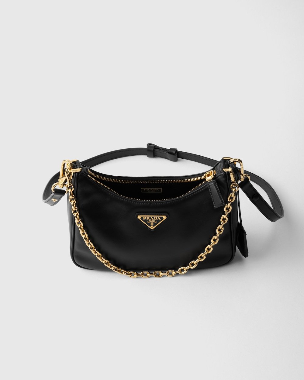 Sleek lines and iconic details define this leather bag with a versatile design characterized by removable handles and decorated with the enameled metal triangle logo.